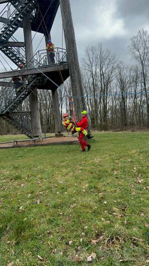 Ein solches Szenario wurde mit der Rettung über das Schrägseil trainiert. Anschließendes seilte sich jede Einsatzkraft mehrmals ob, um die Routine darin aufrecht zu halten.